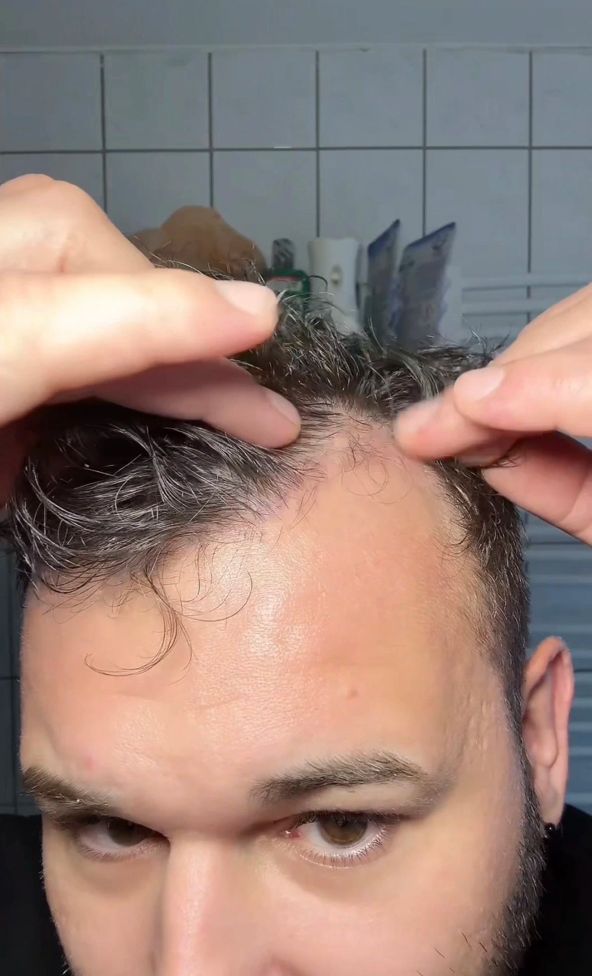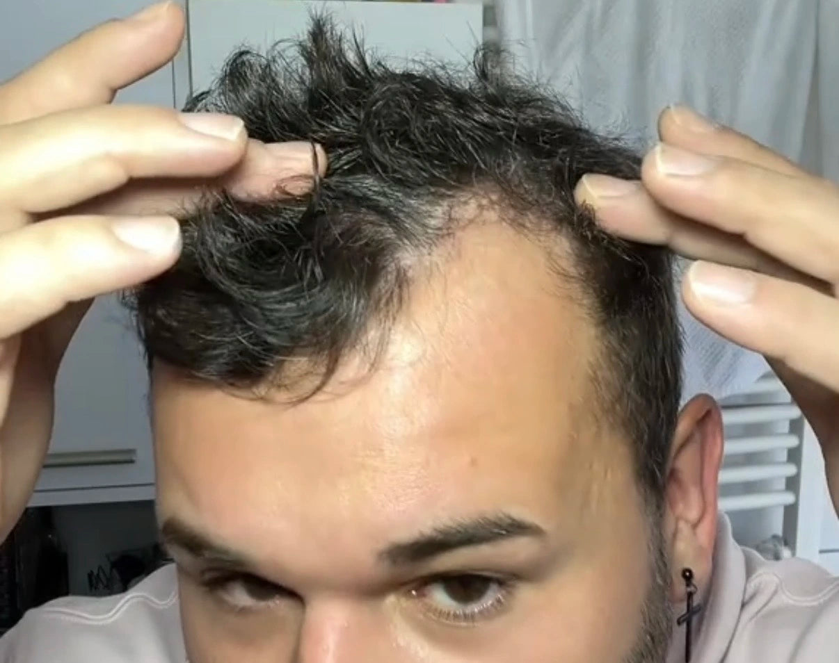 Das Vorher-/Nachher-Bild zeigt die persönliche Erfahrung eines Kunden, der unser Haaröl über einen längeren Zeitraum konsequent angewendet hat. Bei ihm traten feine Babyhaare an den Schläfen auf. Ergebnisse können individuell variieren.